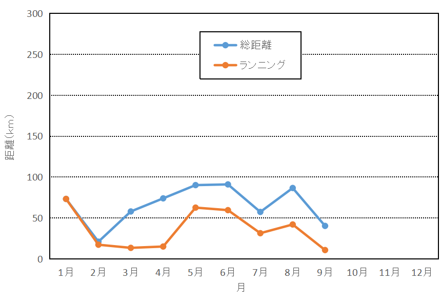昨年の9月はどうだったのか見てみると、ここまでひどくありませんでしたが、かなり落ち込んでいました。そして、10月以降 徐々に増えていって何とか大会に参加、ゴールすることができました。