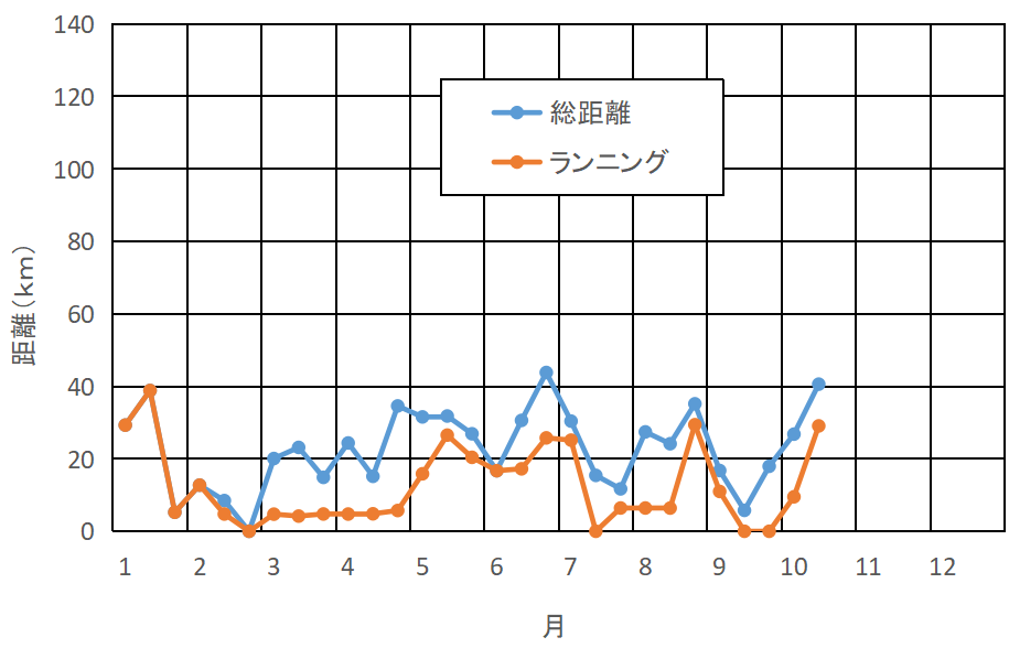 10月中旬の10日間では、ランニング4回ウォーキング2回の計6回で前回より2回多くできました。天候も良く朝晩涼しくなったことで回数を増やすことができ、その結果、総距離で13キロ、ランニングに関しては約20キロ多く走ることができました。