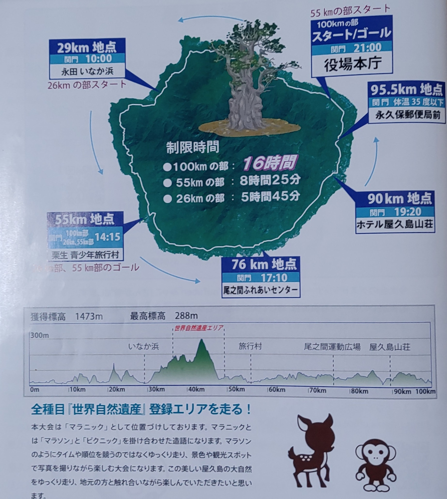 - 関門あり ①いなか浜(29km地点)10:00 ②栗生青少年旅行村(55km地点)14:15 尾之間ふれあいセンター(76.1km地点)17:10 ④ホテル屋久島山荘(90km地点)19:15・体温15度以下 ⑤永久保郵便局(95.5km地点)体温15度以下 今年からホテル屋久島山荘と永久保郵便局地点で体温35度以下が追加された